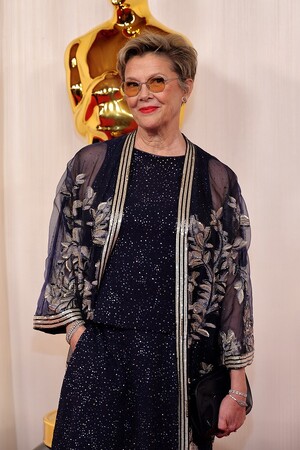 『Nyad』で主演女優賞にノミネートされたAnnette Bening(アネット・ベニング)は、ジョルジオ アルマーニ プリヴェのリーフモチーフスパングルとトリムが際立つミッドナイトブルーのシルクオーガンザのジャカードコートに、ダークブルーのシルクトップスとパンツをコーディネートしました。