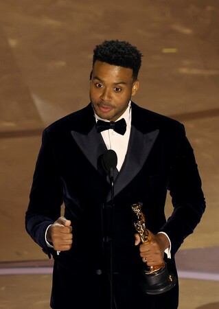 『The Last Repair Shop 』で短編ドキュメンタリー賞を受賞したKris Bowers(クリス・バウワーズ)は、ジョルジオ アルマーニのミッドナイトブルーのベルベットのダブルブレストピークラペルのタキシードに、白いタキシードシャツとベルベットのボウタイを合わせました。