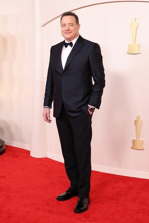 プレゼンターのBrendan Fraser(ブレンダン・フレイザー)は、サテンで縁取られたジョルジオ アルマーニのネイビーブルーのワンボタンピークラペルイヴニングジャケットに、ホワイトのイブニングシャツ、ネイビーブルーのパンツ、ボウタイをセレクトしました。
