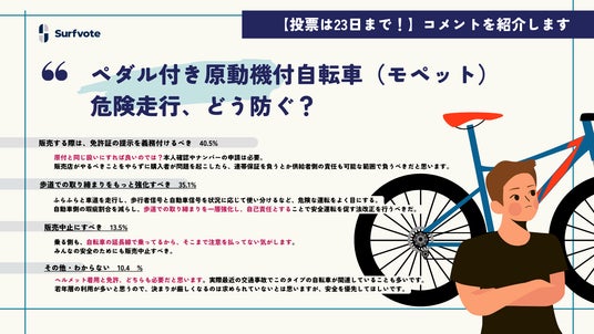 SNSとテクノロジーで社会課題の発見・解決をサポートするソーシャルスタートアップPolimill株式会社(ポリミル、本社:東京都港区、代表取締役:横田えり、以下Polimill社)は12月23日に投票終了予定のイシュー「ペダル付き原動機付自転車(モペット)の危険走行、どう防ぐ?」の途中結果をお知らせします。