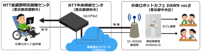 実証実験では、NTT武蔵野研究開発センタ(東京都武蔵野市)、NTT中央研修センタ(東京都調布市)、分身ロボットカフェDAWN ver.β(東京都中央区)を全長100kmの光ファイバで接続し、カフェ内に整備したローカル5Gを経由して、武蔵野研究開発センタ内から障がいのある操作者がカフェのサービススタッフ業務を行った際のロボット操作感、およびアプリケーション間でのネットワーク性能評価を行いました。