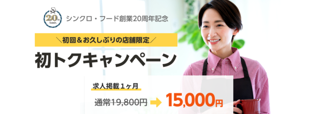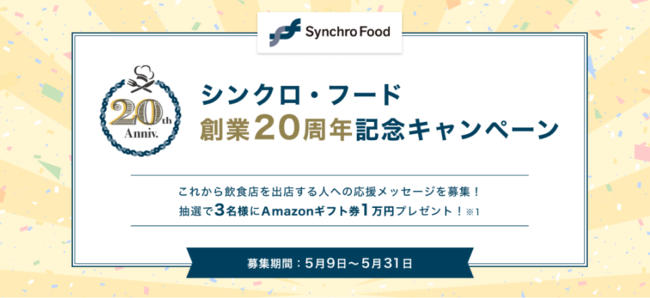 株式会社シンクロ・フード(本社:東京都渋谷区、代表取締役:藤代真一、東証プライム市場:3963)は、本日より創業20周年を記念した特設サイトを公開し、開業者・出店者へのメッセージを募集する「応援メッセージキャンペーン」と、求人@飲食店.COM初掲載の店舗を対象に掲載料を割引する「初トクキャンペーン」の2つのキャンペーンを実施いたします。