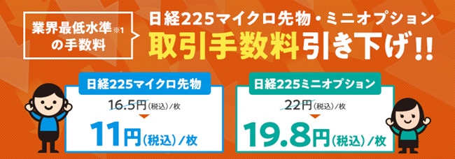 楽天証券では、2023年7月31日(月)16時30分(夜間立会の約定分)より、両銘柄の取引手数料を1枚あたり、「日経225マイクロ先物」を16.5円(税込)から11円(税込)に、「日経225ミニオプション」を22円(税込)から19.8円(税込)に、それぞれ業界最低水準※に改定します。これにより、これまで以上に低コストで両銘柄への投資をしていただける環境が整います。