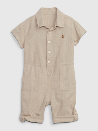 夏のアクティビティ向けには、胸元にブラナンベアの刺繍が入った涼しげなリネンのショートオールや、半袖シャツ×リネンパンツのセット、首周りまで日焼けカバーができるリネン素材のキャップがこれからの季節に贈るベビーギフトにおすすめです。