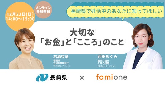 「子どもを願うすべての人によりそい 幸せな人生を歩める社会をつくる」をビジョンに掲げ、法人の従業員向け福利厚生や自治体の住民向け支援を行うヘルスケアサポートサービス「ファミワン」 https://famione.com/benefit/ などを展開する株式会社ファミワン(本社:東京都渋谷区、代表取締役:石川勇介)は、長崎県(知事:大石賢吾)からの委託を受け行なっている「妊活LINEサポート事業」の一環として、オンラインセミナー「長崎県で妊活中のあなたに知ってほしい 大切な「お金」と「こころ」のこと」を2024年12月22日(日)に開催します。