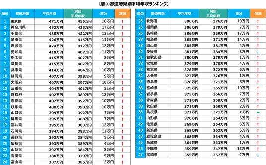 都道府県別:47都道府県のうち44都道府県で年収アップ。前年同様1~5位までを関東エリアが占める