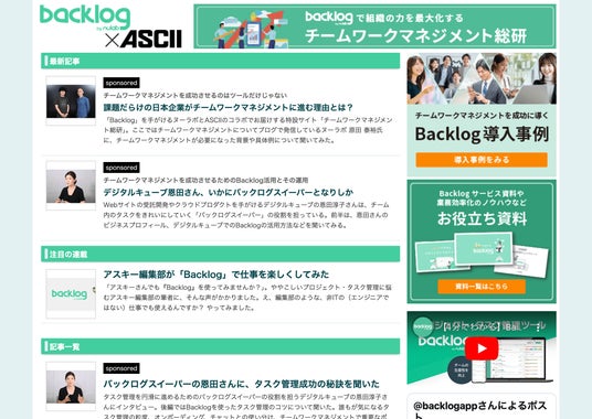 株式会社ヌーラボ(本社:福岡県福岡市、以下 ヌーラボ)が提供している「Backlog」は、Backlogに関するお客様の活用事例や新機能に関する情報が集まったサイト「チームワークマネジメント総研」をASCII.jp内に開設しました。