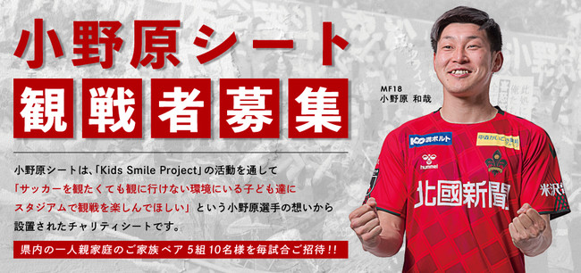 小野原選手本人からの申し出により実現した本シートは、今年3月に開催された「Kids Smile Project」の選手向け勉強会にて、「1人親家庭が抱える課題」について知った小野原選手の「サッカーを観たくても観に行けない環境にある子ども達が大勢いる。そんな子ども達にぜひスタジアムでの観戦を楽しんでほしい!」という想いから設置されることとなりました。