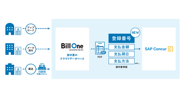Bill OneとConcur Invoiceは2021年から機能連携しており(※1)、Bill Oneで受領・データ化した「支払金額」「支払期日」「支払方法」などの請求書情報をConcur Invoiceに連携することが可能です。今回、連携する項目に「登録番号」を追加します。これにより、Concur Invoiceのユーザーは支払申請の際に登録事業者番号の入力が不要になり、インボイス制度に伴い発生する工数を削減することができます。