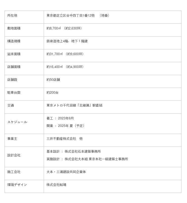 三井不動産株式会社(所在:東京都中央区、代表取締役社長:植田俊)は、東京都足立区谷中にてライフスタイル型商業施設「(仮称)三井ショッピングパーク ららテラス北綾瀬」を今般建築着工したのでお知らせいたします。なお、開業は2025年夏を予定しています。