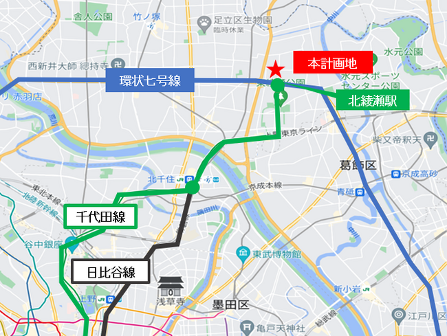 本計画地は、東京メトロ千代田線「北綾瀬」駅前に位置しています。北綾瀬駅北改札からペデストリアンデッキで直接接続される予定となっており、駅前の交通広場にも面するアクセス性の高い施設です。駅前立地の高いポテンシャルを活用し駅前の賑わいを創出することで、活気ある街づくりに貢献いたします。