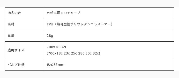 強度が高く軽量なのが特徴のTPUインナーチューブです。ゴムのように弾力性があり、耐パンク性能が高いです。28gと超軽量で転がり抵抗が低い。優れたチューブとなっています。