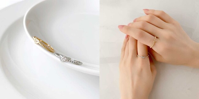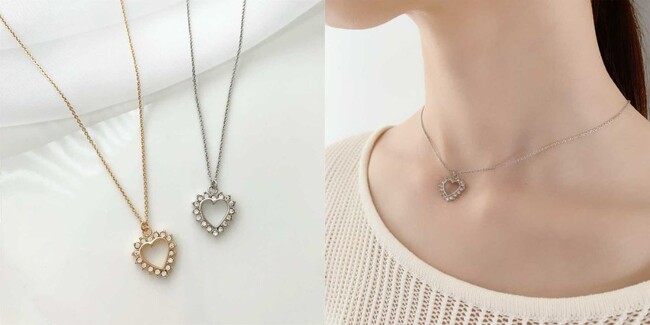 さりげないラインストーンとの組み合わせが可愛いハートアクセサリーは、リングとネックレスの2タイプご用意しております。