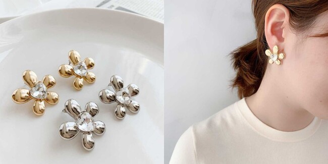 ボリューム感のあるこちらのメタルフラワーピアスは、なんと中央のビジューがハート型に!