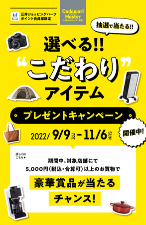 期間中、対象店舗にて、対象カードもしくはポイント用QRのご利用で、5,000円(税込・合算可)以上お買上げいただき、特設サイト内のキャンペーン専用応募フォームからご応募いただいた方の中から抽選でご希望の賞品をプレゼントいたします。