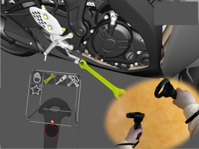 ●両手で部品を動かした後、片方のコントローラを工具表示に切り替え、工具と部品との干渉チェックを行う。
