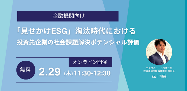 アスタミューゼ株式会社(本社:東京都千代田区、代表取締役社長 永井歩)は、2024年2月29日(木)11:30-12:30に、ESG活動の可視化をテーマとした金融機関の方々を対象とした無料ウェビナー「『見せかけESG』淘汰時代における投資先企業の社会課題解決ポテンシャル評価」を開催いたします。昨年12月に実施した同タイトルのウェビナーが大変好評だったため、2月にも再開催することになりました。