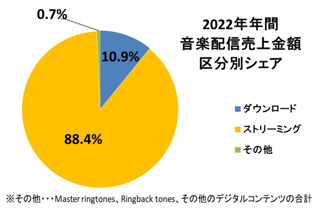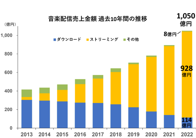 2022年年間の音楽配信売上は、1,050億円(対前年比117%)と2005年の統計開始以来最高額、初の1,000億円超えを達成し9年連続のプラス成長、5年連続の2桁増となりました。
