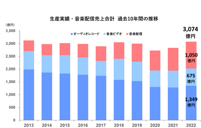 音楽ソフト・音楽配信売上合計は3,074億円で、4年ぶりの3,000億円超え