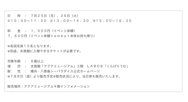 『横浜・八景島シーパラダイス』では、2022年7月25日(月)、26日(火)の2日間限定で、ダンボールで作るプログラミング教育ロボット「embot(エムボット)」を活用したプログラミングイベントを開催いたします。「embot」は、ダンボールと電子機器を用いてロボットを組み立てることで、電子工作やものづくりの基礎を学ぶことができます。また組み立てたロボットは、タブレットやスマートフォンにインストールした専用アプリを用いて、子どもでも簡単に操作することができます。