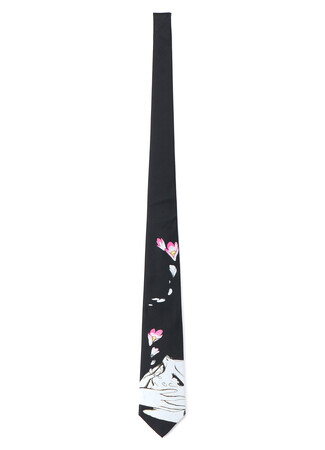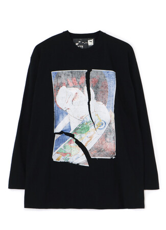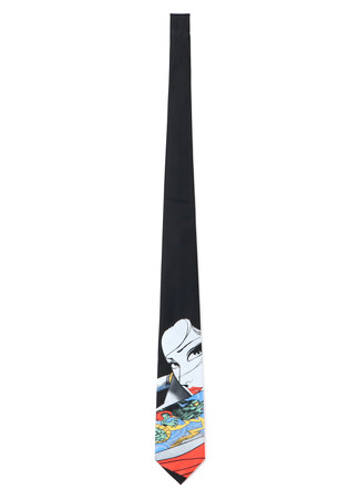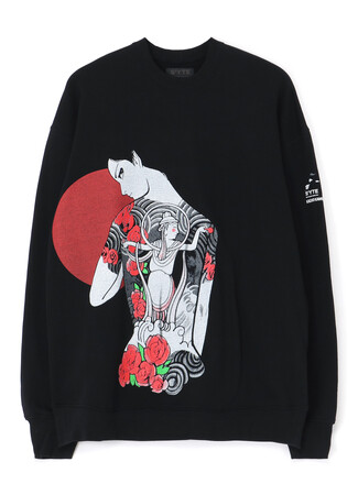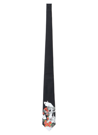 腕に天翔ける龍の刺青をし、小太刀を持つ艶やかな女性の絵をあえてモノクロプリントにすることで、女性の持つ鋭い空気感を表現したレイヤードパンツ。長袖Tシャツとシルクネクタイはフルカラーにすることで、絵本来のもつ艶やかさと力強さを浮かび上がらせる。