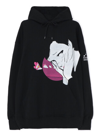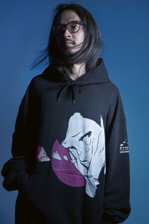 “劇画史に一時代を画した”と評される「同棲時代」は、映画・ドラマ化と共に社会現象となった作品。未来が曖昧な男女のささやかで不確かな幸せがやがて崩壊をしていく様を、美しく文学的なモノローグと、息をのむほど劇的で美しいシーンを次々と眼に飛び込むグラフィカルなコマ割りで表現する。2011年に発売された上村一夫氏の大図鑑「リリシズム」表紙として有名な主人公・飛鳥今日子の花と涙は、叙情あふれ感傷的女性美を確立。フーディー、トートバッグ、ネクタイにプリント。また、フーディーの背景にはマゼンダを加えることで、花の涙をより儚く、美しく魅了させる。腕には、S’YTE ×Kazuo KamimuraのWネームを配した。