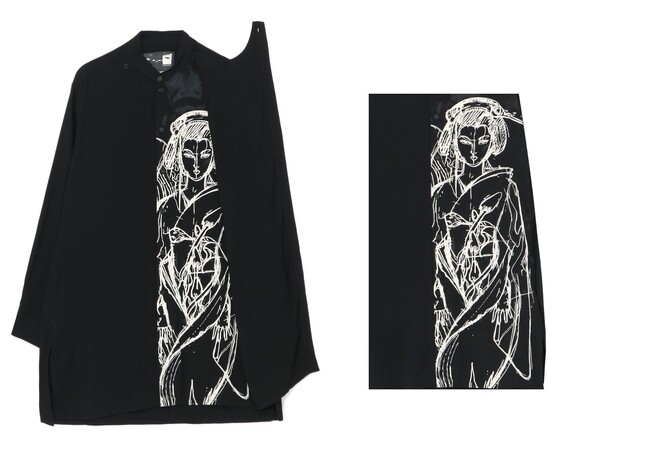 幻の一枚絵より、花に身体を包まれながらも凛とした立ち姿の女性の絵をプリントした、「女」と「花」が織りなす世界観をロング丈のスタンドカラーシャツに落とし込んだ作品。
