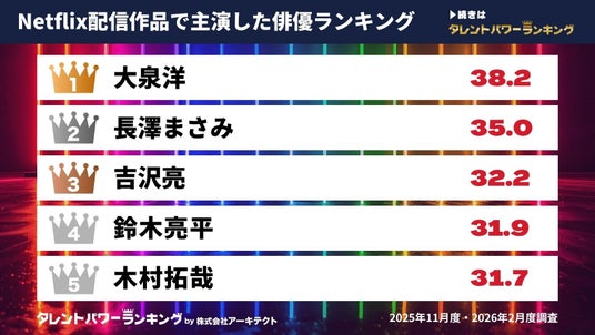 『タレントパワーランキング』では、タレントパワーランキングに登録されている、Netflix配信作品で主演した俳優について、それぞれの結果を調査。