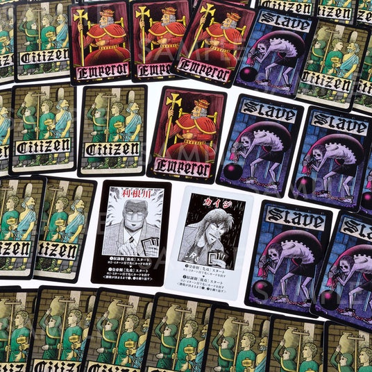 『賭博黙示録カイジ』の中でもクライマックスと言えるカイジvs利根川の名勝負『Eカード』を悪魔的商品化っ・・・・!たったの3種、計10枚のカードで行なわれる勝負は、カードの内訳を超えて互いに裏の裏の裏まで読み合う極限の心理戦!耳を賭けるか?土下座を賭けるか?あの恐怖と興奮を体験できる本物のカードセットだっ・・・・!