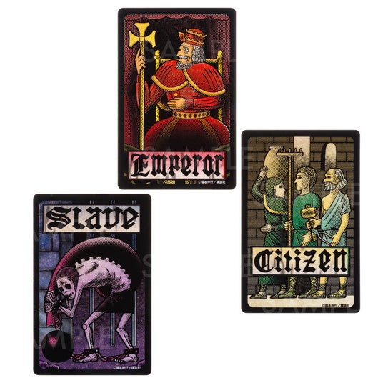 『賭博黙示録カイジ』に登場する究極の心理戦ゲーム『Eカード』が、耐水ステッカー3枚セットで登場!ファンの間で語り継がれるカイジvs利根川の名勝負で使われた悪魔的カード3種を、新たにリファイン!見るだけで緊張感が走るこのシールを、あなたはどこに貼るか?それとも貼られるか!?
