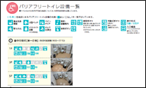 施設内のバリアフリートイレの入口の幅、音声案内の有無、手すり、大型ベッド、オストメイト設備の設置状況など