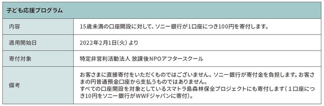 「子ども応援プログラム」とは、次世代を担う子どもたちの育成支援を目的として、15歳未満の口座開設1口座につき100円をソニー銀行が特定非営利団体「放課後NPOアフタースクール」へ寄付する取り組みです。