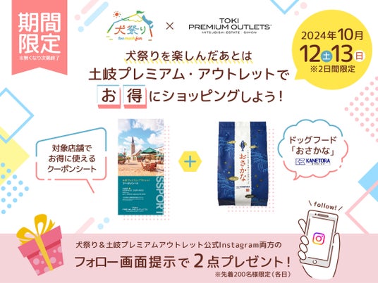 土岐プレミアム・アウトレットと犬祭りの両方の公式インスタグラムをフォローいただき、フォロー画面を犬祭り本部ブースでご提示いただくと、土岐プレミアム・アウトレットでのお買い物がますますお得になるクーポンシートと国産ドッグフード(各日先着200名様)をプレゼントします。