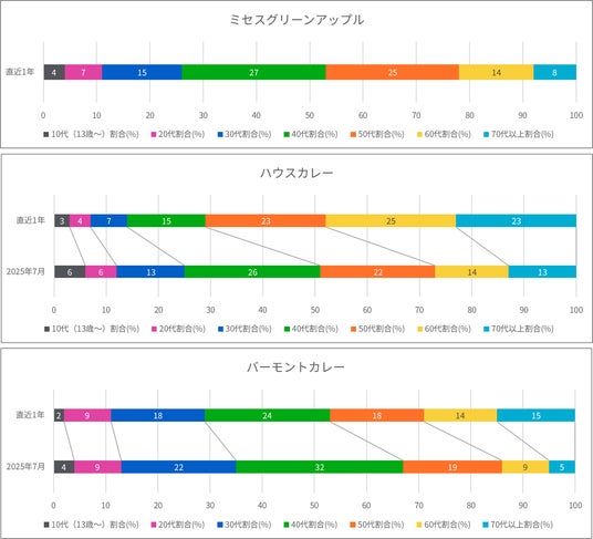 ここから、本CMの影響が特に大きかったと考えられる「ハウスカレー」と「バーモントカレー」に注目して検索の年代比を見ると、2025年7月はいずれも30代と40代の割合が増加していることが分かります。「ミセスグリーンアップル」の検索層は40~50代が中心で、次いで30代が多くを占めており、当グループのファン層と重なる40代への影響が顕著に現れています。