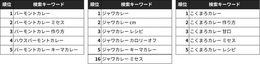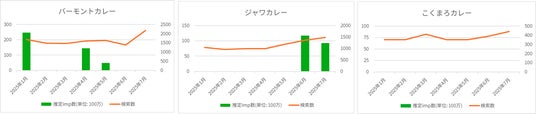 「ハウスカレー」の検索数とCM放映量の相関を見ると、CM放映とキャンペーンが同時に始まった7月に検索数が大きく上昇しました。キャンペーン対象の3商品も、いずれも7月に検索数が増加しており、個別のテレビCM放映がなかった「バーモントカレー」と「こくまろカレー」も同月に検索を伸ばしています。