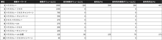 7月に「ハウスカレー」と検索した人の共起キーワード上位には、「ミセス」や「キャンペーン」が並び、その多くがMrs. GREEN APPLEのCMや本キャンペーンに関連する内容であることが分かります。また、「バーモントカレー」や「こくまろカレー」においても、商品の検索数が増加するとともに「ミセス」の検索も多く行われています。