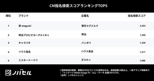 ソフトウェアとプロフェッショナル人材の力でマーケティングの民主化を目指すノバセル株式会社(本社:東京都港区、代表取締役社長:田部正樹、以下ノバセル)は、テレビCM効果の分析サービス「ノバセル トレンド」を活用し、2025年7月に放映されたテレビCMの指名検索スコアランキングを発表します。