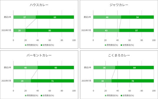 検索の男女比を比較すると、各商品とも2025年7月のCM放映時に女性の検索割合が通常より増しました。「ミセスグリーンアップル」の検索でも女性が7割を占めており、本キャンペーンが主に女性層に影響を与えたことが分かります。「ジャワカレー」は6~7月に俳優・反町隆史さん出演のCMが放映されており、「大人の夫婦が楽しむカレー」という男性目線のイメージも相まって、女性の検索は微増にとどまりましたが、「ハウスカレー」全般や「バーモントカレー」、「こくまろカレー」では、女性による検索の増加が顕著に見られます。