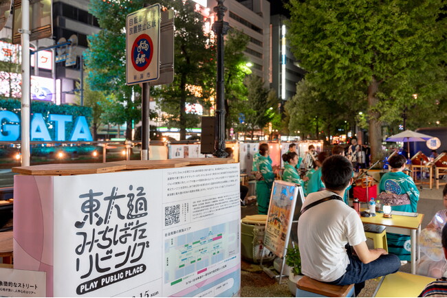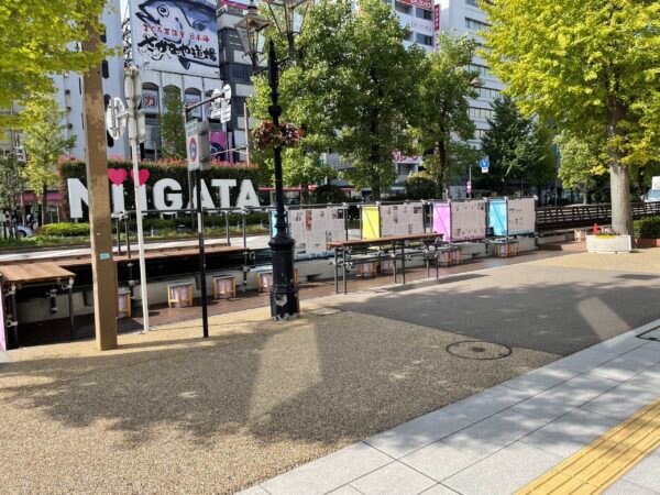 新潟駅前の東大通において、歩きたくなる“人中心の空間づくり”に向けた取組の一環として設置されたパークレット。