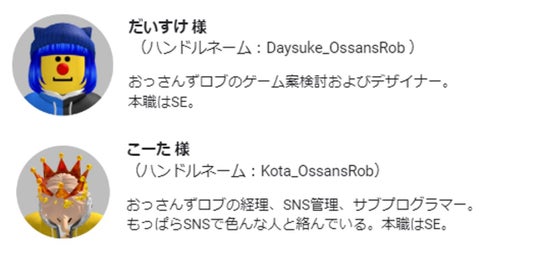 ロブロックスの様々なゲームを作成されているプロのクリエイターチーム「おっさんずロブ」から、だいすけ様とこーた様を先生としてお迎えし、教えていただきました。