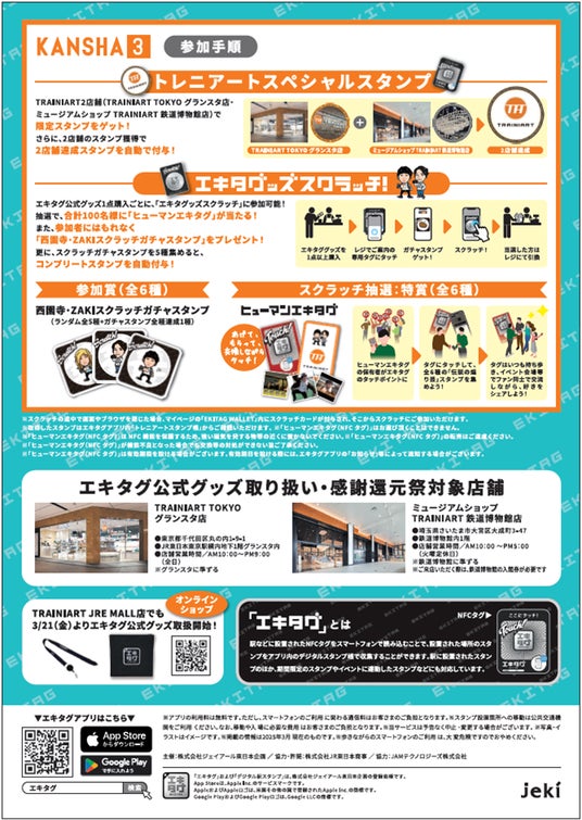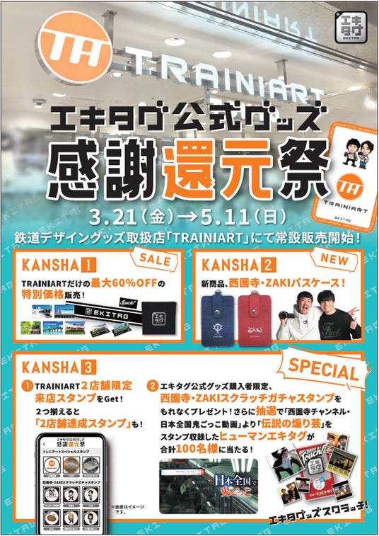 ◎ 同日開催のリアル店舗対象企画「エキタグ公式グッズ感謝還元祭」では、いつもエキタグを楽しんでくださっている皆様へ感謝の気持ちを込めて、【3つの「感謝還元(KANSHA)」】を展開します。