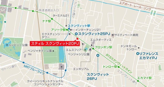 本事業は、バンコクを代表する商業集積地であるアソーク・プロンポンエリアにおいて、ラグジュアリークラスの分譲マンションの開発を行うものです。バンコクを代表する目抜き通りであるスクンヴィット通り沿いに位置し、BTSスクンヴィットライン「Asoke(アソーク)」駅・「Phrom Phong(プロンポン)」駅、MRT「Sukhumvit(スクンヴィット)」駅の2路線3駅が利用可能な利便性の高い立地です。アソーク駅はバンコクで第2位の乗降客数を誇り、交通の結節点としても重要な役割を果たしています。周辺にはベンジャキティ公園やベンジャシリ公園といった大規模な緑地が広がっており、オフィスや大規模商業施設が集積するバンコクの中心部にありながら、自然環境にも恵まれています。また、インターナショナルスクールや国際水準の医療を提供する病院などの生活利便施設も充実し、日本人や欧米人を中心とした外国人にも人気のエリアです。さらに、高速道路出入口まで車で約5分とスワンナプーム国際空港をはじめとした、バンコク近郊への車でのアクセスも良好です。