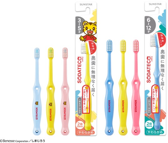 この30年間で、5~9歳の永久歯のむし歯は減少傾向にありますが、年齢があがるとともにむし歯の罹患率が増加する事実は30年前から変わりません※2。サンスターでは、この原因の一つとして、こどもが大きくなるにつれて保護者の仕上げみがきの機会がなくなることや一人みがきのスキル不足があると考えています。上手に一人みがきができるようになるためには幼いころからの歯みがきの習慣が非常に大切です。「正しいハブラシの持ち方を覚えてほしい」「むし歯になりやすい奥歯も守りたい」そんな声を受け、自然と正しい持ち方が身につき、ななめヘッドで奥歯に無理なく届いてみがきやすい新設計のハブラシ「ソダテコこどもハブラシ(3-5才用・6-12才用)」を開発しました。また、一人みがき後に使用する仕上げみがき用ハブラシ「ソダテコこどもハブラシ(仕上げみがき用)」も用意しています。