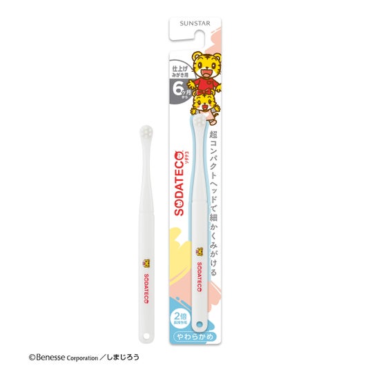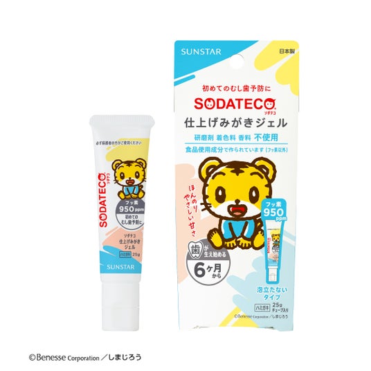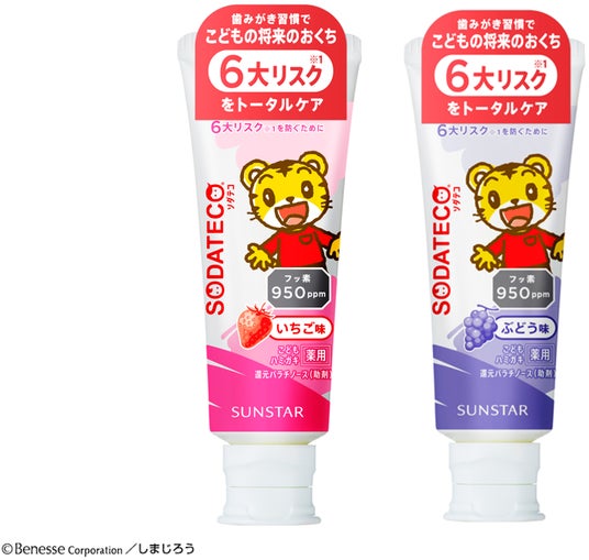また、“近い将来に気になる子どものおくち悩み”の上位としてあげられる、むし歯・歯の着色・おくち全体の汚れ・歯石の沈着・歯垢の付着・口臭の6大リスク※1を予防するための「ソダテコこどもハミガキ」のほか、歯の生え始める生後6か月頃からむし歯予防ができる「ソダテコ仕上げみがきジェル」を開発しました。デザインは、毎日の歯みがきがお子さまにとって楽しい習慣になるよう株式会社ベネッセコーポレーション「こどもちゃれんじ」の人気キャラクターである「しまじろう」を採用しています。