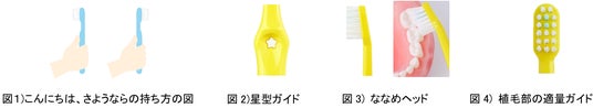 乳歯の生え始めの時期から正しいハブラシの持ち方で歯をみがく習慣をつけることは重要です。「ソダテコこどもハブラシ(3-5才用・6-12才用)」は、「こんにちは」「さようなら」の持ち方がしやすい星型ガイド(指当て部)を採用し、お子さまの手になじみやすく、みがきやすさにも配慮した、人間生活工学に基づくハンドル設計です。さらに、ヘッド部を傾斜のあるななめヘッドにすることで、小さなおくちでも奥歯に無理なく届き、みがきやすい仕様にしました。