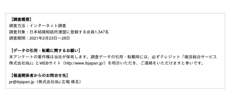 株式会社IBJ(代表取締役社長:石坂茂、本社:東京都新宿区、東証一部:6071)が運営する、日本一*の成婚数を誇る結婚相談所ネットワーク『日本結婚相談所連盟』(https://www.ibjapan.com/)は、会員1,347人に『オンラインお見合い』に関するアンケートを実施し、オンラインツールの活用により変化する”コロナ禍の婚活”を調査しました。