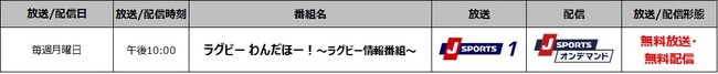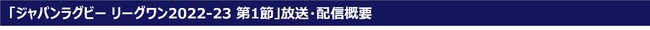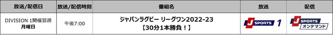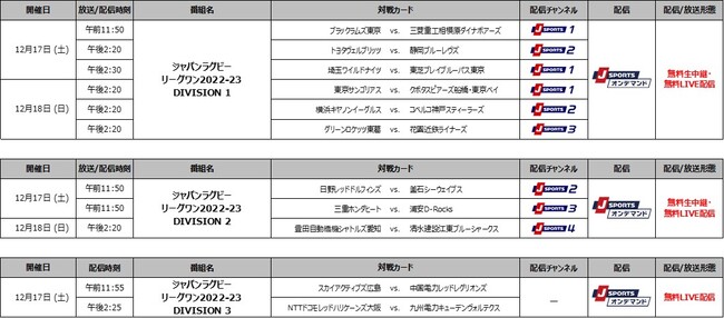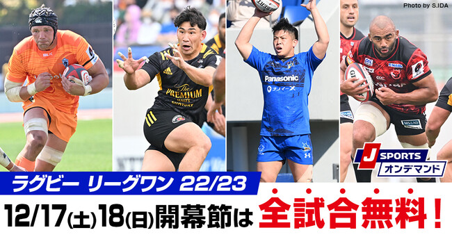 J SPORTSはジャパンラグビー リーグワンの事業共創パートナーとしてラグビーの更なる発展に向けて、DIVISION 1、2の全試合を実況・解説付きで放送するとともに、J SPORTSオンデマンドではDIVISION 3も含めた全試合をLIVE配信を中心にお届けいたします。今季もラグビーファンのみなさまにお楽しみいただけるよう、経験豊かな実況アナウンサー・解説陣と、長年蓄積してきた豊富な情報を活かした番組をお届けすることでジャパンラグビー リーグワンの魅力を最大限に発信してまいります。さらに、開幕節はより多くの方に楽しんでもらうために無料で生中継・LIVE配信いたします。DIVISION 1では初代王者・埼玉ワイルドナイツと昨季4位・東芝ブレイブルーパス東京の対戦や、昨季2位・東京サンゴリアスと昨季3位・クボタスピアーズ船橋・東京ベイの対戦など6試合、DIVISION 2では積極的に補強を進めた三重ホンダヒートと新たに生まれ変わった浦安D-Rocksによる対戦など3試合、 DIVISION 3ではスカイアクティブズ広島と中国電力レッドレグリオンズによる広島ダービーなど2試合が行われます。各試合は12月23日(金)までの期間は、再放送・見逃し配信でも無料でご視聴いただけます。