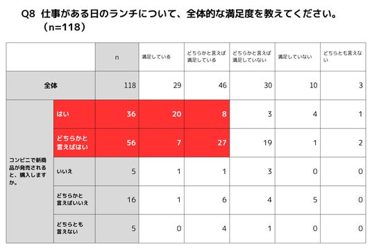 「働く日のランチの満足度が高い人」(=一日をごきげんに過ごせている人)ほど、複数商品を組み合わせて購入&新商品への関心度も高い結果に