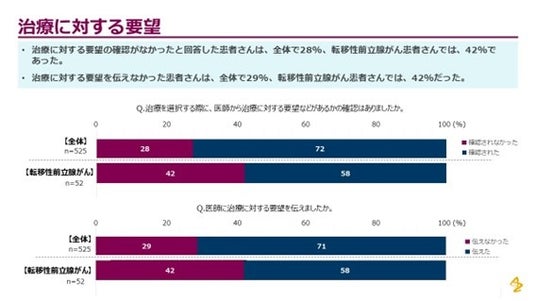 患者さんの治療に対する要望が医師と共有されているかを確認したところ、患者さん全体の28%、mPCでは42%が、「治療を選択する際に、医師から治療に対する要望などがあるかの確認はありましたか」に対し「確認されなかった」と回答しました。また、全体の29%、mPCでは42%の患者さんが「医師に治療に対する要望を伝えましたか」との質問に対し、「伝えなかった」と回答しました。要望を伝えなかった患者さん(全体の29%:150 名)のうち、要望があったにもかかわらず伝えなかった患者さんは89名(59%)存在し、これらの患者さんの65%にあたる58名は医師から治療に対する要望を確認されていませんでした。こうした結果から、患者さんの要望が医師と適切に共有されていない場合も少なくないと考えられ、前立腺がん治療におけるShared Decision Makingの課題が示唆されました。