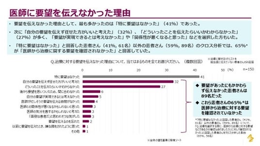 3. 患者さん全体の29%となる150名が治療に対する要望を伝えていなかった。また、要望を伝えなかった患者さんのうち、要望があったにもかかわらず伝えていなかった患者さんが59%おり、そのうちの65%の患者さんが医師から治療に対する要望を確認されていなかった。